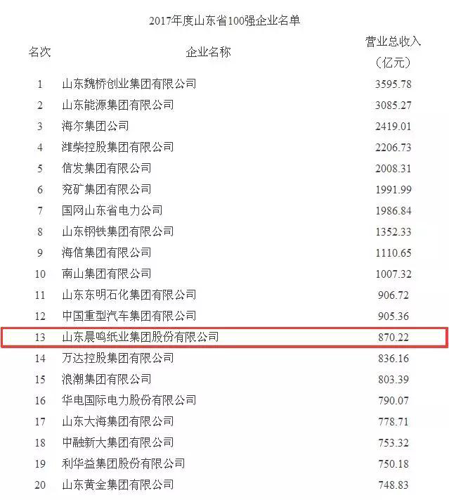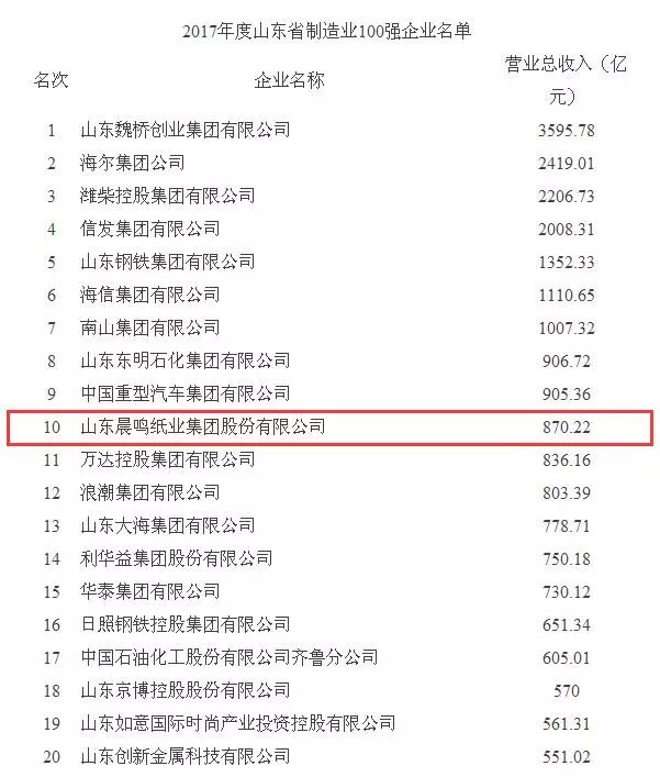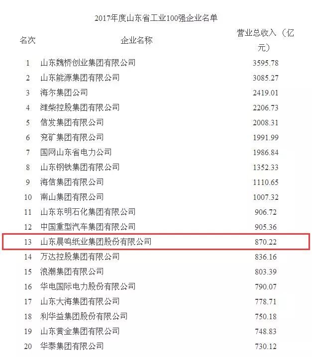 日前我省公布了2017年度山東省100強(qiáng)企業(yè),晨鳴集團(tuán)位列第13位,較上年提升1位,繼續(xù)位居行業(yè)榜首。同時公布的還有2017年度山東省工業(yè)100強(qiáng)企業(yè)、山東省制造業(yè)100強(qiáng)企業(yè)榜單,晨鳴集團(tuán)分列榜單的第13位和第10位,與上年持平。