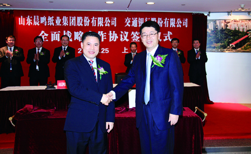 晨鳴集團(tuán)董事長(zhǎng)陳洪國(guó)在致辭中表示,交通銀行是百年銀行,是民族金融品牌的傳承者和中國(guó)銀行業(yè)改革的先行者,為中國(guó)經(jīng)濟(jì)的發(fā)展提供了強(qiáng)有力的支持,也為晨鳴集團(tuán)的發(fā)展注入了活力,是公司最重要的合作伙伴。當(dāng)前,晨鳴集團(tuán)計(jì)劃在山東、湖北、江西、廣東等地投資200多億元,建設(shè)一批國(guó)際尖端水平的高效節(jié)能環(huán)保項(xiàng)目,確保企業(yè)持續(xù)快速發(fā)展,也為與交通銀行的合作提供了更為廣闊的空間。他相信,與交通銀行進(jìn)行全方位合作,一定能夠?qū)崿F(xiàn)銀企共贏。
